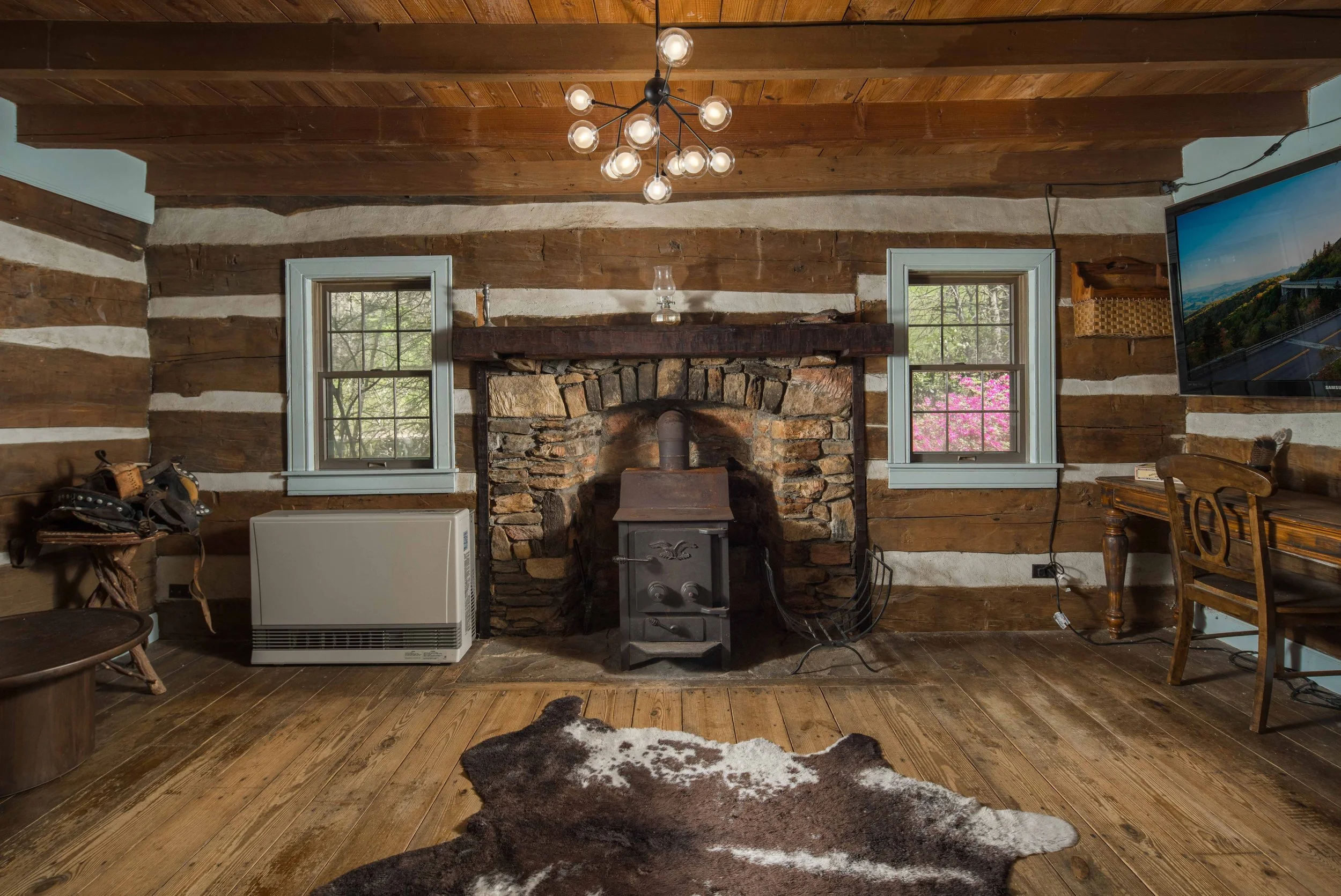 Welcome to 1534 NC 194—where timeless craftsmanship meets modern comfort in this fully furnished, reconstructed 1847 log cabin. Set on 3.75 picturesque acres with horse trails and sweeping views, this one-of-a-kind home was meticulously rebuilt by a master tradesman for his own family, showcasing hand-hewn beams, hand-planed joists, wide plank floors, and hand-dressed wainscoting. Enjoy a fully remodeled kitchen, a brand-new hardscaped patio with outdoor furniture, and a private hot tub under the stars.